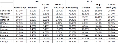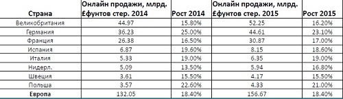 - темпы роста онлайн продаж 2014/15: Европа 18,4%, США 22%, Канада 16%.