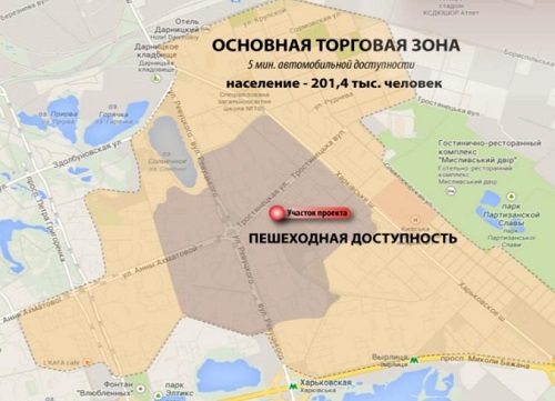 Объект находится один из самых густонаселенных районов Киева – Дарницком. Объект имеет два фасада, один из которых расположен вдоль ул. Тростянецкой на стороне «вечернего потока» с пассажиропотоком более 70 тыс. чел./день. Всего у объекта три входа с разных сторон.