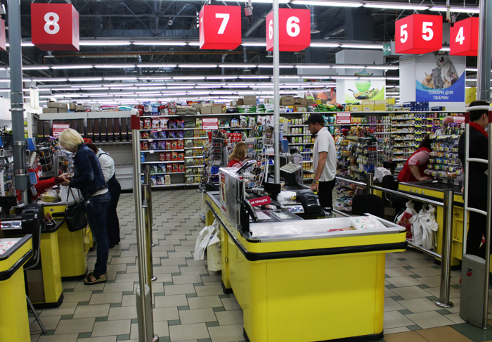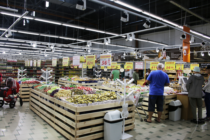 Осматриваемся и с удовлетворением отмечаем хорошую навигацию: названия товарных групп написаны большими буквами, видны практически из любой точки торгового зала. Цены также указаны ярко и заметно, что удобно для людей, оставивших дома свои очки.