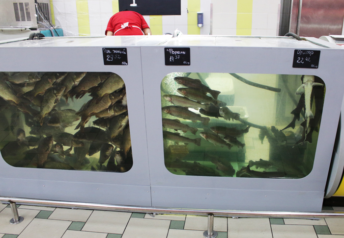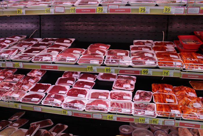 Наше внимание привлекает наличие баранины (такое встретишь не в каждом супермаркете), вымени, телятины. Притом по сравнительно доступным ценам. Еще одна особенность: мясо кролика и утки упаковано, хотя более привычными видеть их исключительно в витрине.