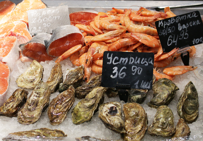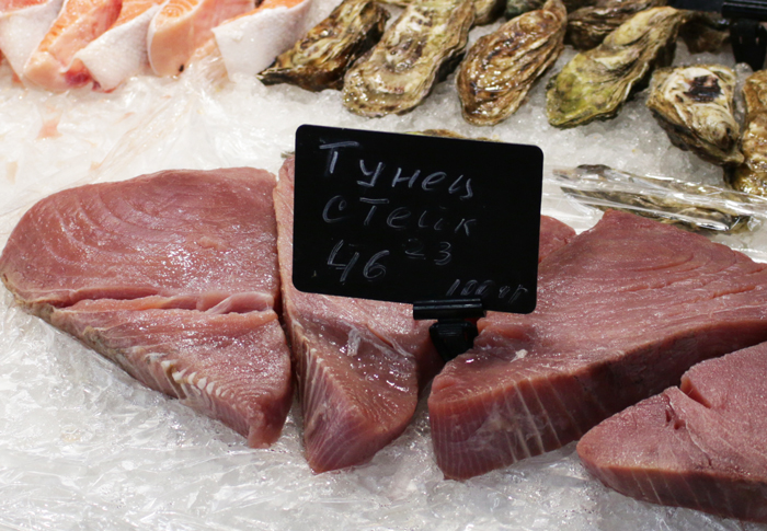 Рыбная продукция. Обращаем внимание на очень красивые креветки и тунец – радуйтесь, любители экзотики!