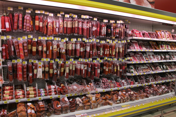Весьма широк в магазине ассортимент колбасных и мясных изделий.