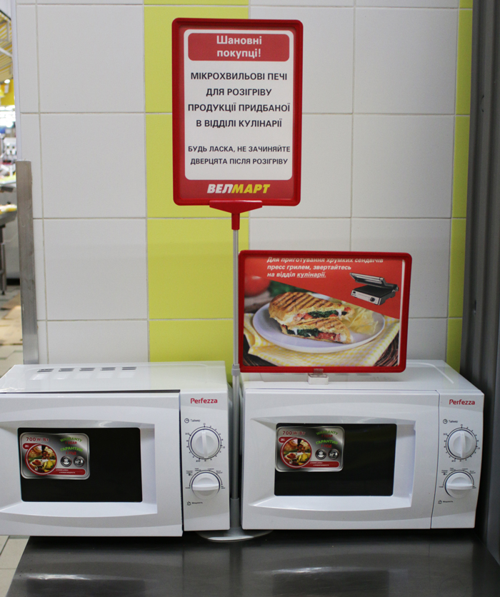 Появление в магазине зоны кафе было вызвано тем, что наличие поблизости офисов создает спрос на горячие обеды. Кроме того, купив продукты в магазине, человек может разогреть их в микроволновке и пообедать в кафе.