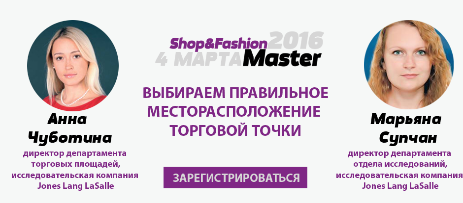 Узнать, как выгодно и успешно выбрать месторасположение торговой точки, можно будет в докладе Анны Чуботиной, директора департамента торговых площадей, и Марьяны Супчан, директора департамента отдела исследований исследовательской компании Jones Lang LaSalle.