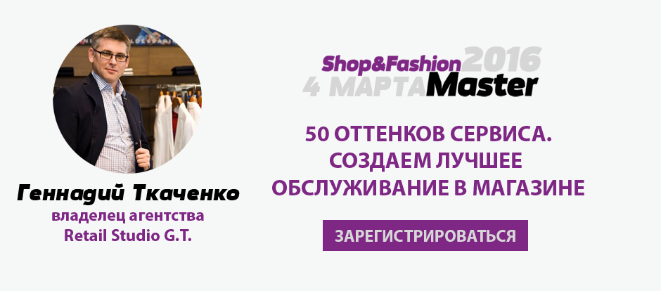 Геннадий Ткаченко, ТОП-спикер конференций ShopMaster-2010-2013 гг., ведущий тренер магазинов и бутиков в СНГ, владелец специализированного агентства Retail Studio G.T., в своем мастер-классе «50 оттенков сервиса» поделиться секретами создания самого лучшего сервиса в магазинах. Геннадий Ткаченко более 12 лет занимается развитием процессов работы магазинов и обучением персонала. Управляет розничными сетями в аутсорсинге и консультирует собственников. Уникальный и единственный в своем роде експерт такого уровня. Среди клиентов: Hiton, Cacharel, Pierre Cardin, Marks & Spencer, Centro, Carlo Pazolini, Antonio Biaggi, Vitto Rossi, Frey Willy, Tango, Brocard, Ideal и другие.