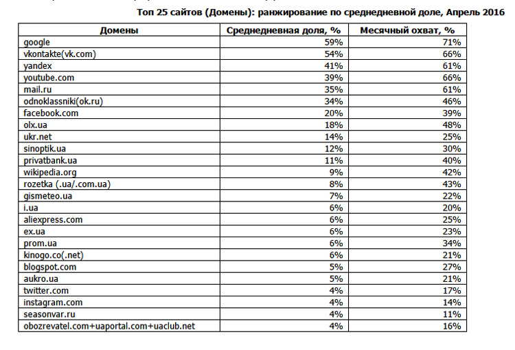 По итогам апреля 2016 г. на базе медиа-панели численностью 5 тыс. человек определен список популярных доменов, посещаемых украинскими пользователями: