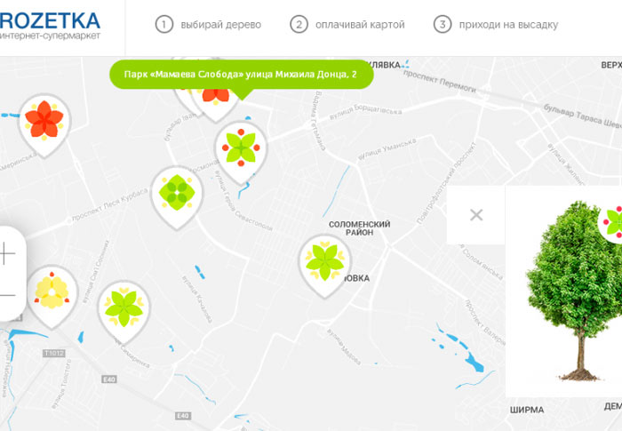 Данный проект для «Розетки» создала маркетинговая компания Promodo. Сайт выполнен в виде интерактивной карты Киева. На ней можно выбрать локацию и доступную для высадки породу дерева, заплатить картой, а затем в указанное время, по желанию, прийти на торжественную высадку, которую осуществляют сотрудники «Розетки».