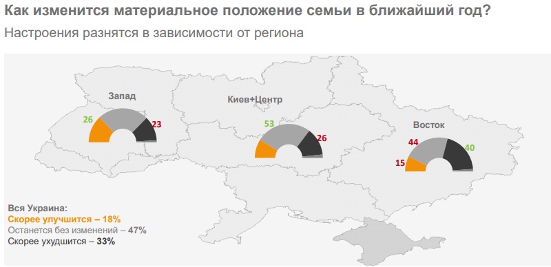 “Когда заходит речь о видении финансового будущего страны, стоит в первую очередь обращать внимание на региональные различия, - говорит Марина Костромина. - В декабре прошлого года мы провели последний такой “замер”. По его результатам, 26% населения западных регионов считают, что “вот-вот все наладится”, а на востоке таких людей только 15%. Более того - 40% населения востока считают, что дальше будет хуже”.