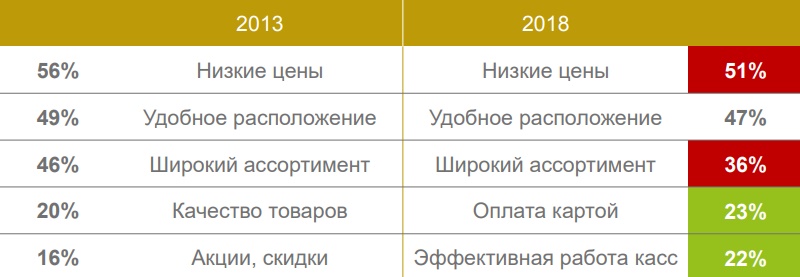 Если в 2013 году “идеальный” магазин был торговой точкой с самыми низкими ценами, то на сегодняшний день запросы потребителей несколько изменились. Покупатель все еще ждет дешевизны, удобного расположения и широкого ассортимента товаров, однако эти факторы уже сложно назвать ключевыми.