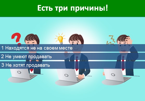 Часто это связано с тем, что самому менеджеру продукт не нравится. Действительно: очень сложно продавать то, во что не веришь. Другая причина - сложная система мотивации, когда люди до конца месяца не понимают, сколько именно они заработают.
