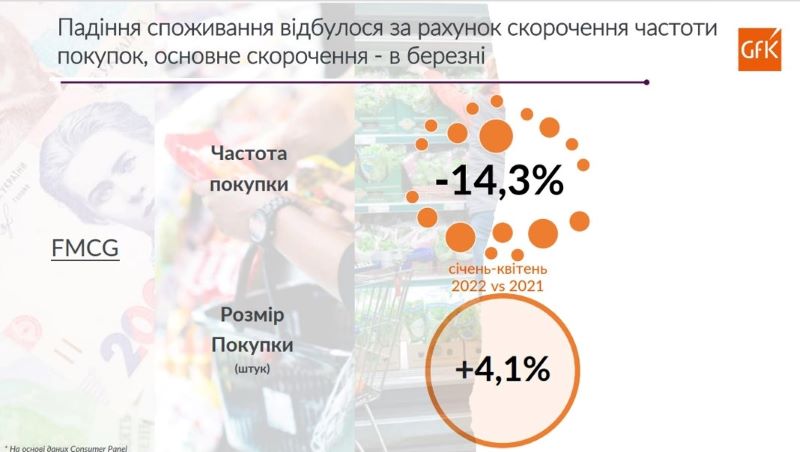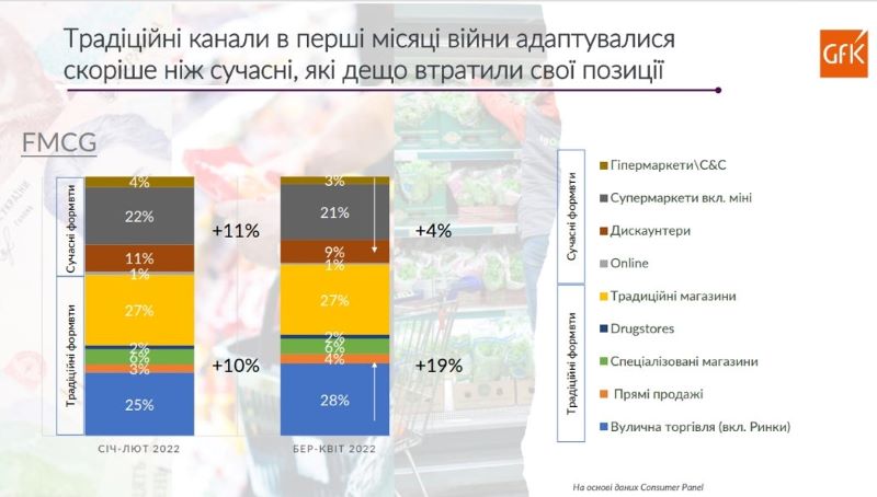 Перші місяці війни стали справжнім викликом для українського ритейлу. Кількість торгових точок для покупки товарів повсякденного вжитку (FMCG) в репертуарі споживача зменшилась на 7%. З одного боку, це було викликано об’єктивними чинниками – деякі магазини не працювали, але і самі споживачі вибирали більш досяжні місця для покупок, що знаходяться недалеко від дому. Частота покупок порівняно з минулим роком теж помітно впала – у березні на 17%, а в квітні – 12%. Але традиційні канали, особливо традиційні магазинчики біля дому та вулична торгівля, у перші місяці вторгнення почували себе більш впевнено порівняно із сучасними форматами (гіпермаркетами, C&C, супермаркетами та дискаунтерами), збільшивши свою частку ринку в березні – квітні 2022, як порівняно із січнем – лютим 2022 року, так і відповідним періодом минулого року. Вперше за багато років темп приросту традиційних форматів (+19% в грошовому вимірі) випередив сучасні формати (+4%).