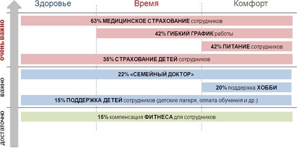 Безусловными лидерами стали такие темы как «здоровое питание» и «забота о здоровье» (43% опрошенных каждому из этих пунктов присвоили наивысший балл), а также «путешествие и отдых сотрудников» (38% респондентов поставили высший балл). Также достаточно большой интерес вызывают программы по формированию у сотрудников «полезных привычек» (57% опрошенных поставили 4 и 5 в данном пункте), умение находить «баланс работы и жизни» (42,3% поставили 4 и 5 в данном пункте) и помощь сотрудников «в развитии детей» (47,6% ответов в диапазоне 4-5).