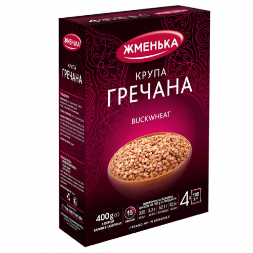 Крупа гречана в пакетиках для варки ТМ “Жменька” представлена в розфасовці 4-и пакетика по 100 г.