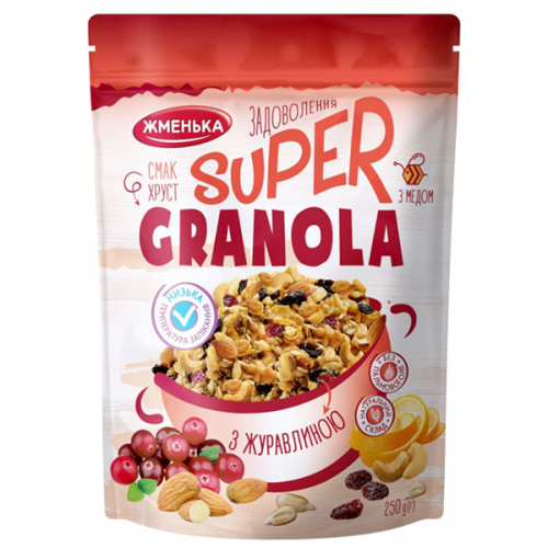 Гранола ТМ «Жменька» – це ідеальне поєднання смаку, користі та зручності. Це відмінний цільнозерновий сніданок або перекус, який не потребує приготування. Супер Гранола з журавлиною – це ідеальне поєднання ягід журавлини, солодких родзинок, вівсяних пластівців, мигдалю, кеш’ю, насіння соняшника, апельсинової цедри, кукурудзяних шариків, з додаванням меду, що запечені в солодкому сиропі до золотистого кольору та веселого хрусту!