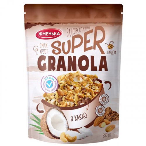 Гранола ТМ «Жменька» – це ідеальне поєднання смаку, користі та зручності. Це відмінний цільнозерновий сніданок або перекус, який не потребує приготування. Супер Гранола з какао – це ідеальне поєднання ароматного какао та ніжної кокосової крихти, білих шоколадних крапель та горішків мигдалю і кешью, відбірних вівсяних пластівців та кукурудзяних шариків, з додаванням меду, що запечені в солодкому сиропі до золотистого кольору та веселого хрусту!
