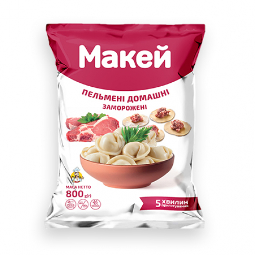 Приготування: Заморожені пельмені занурити в підсолений окріп (на одну частину продукту 4 частини води, сіль за смаком) помішуючи, довести до кипіння та варити 5 хвилин в киплячій воді після спливання. Обережно вийняти шумівкою, додати масло або сметану за смаком. Смачного!