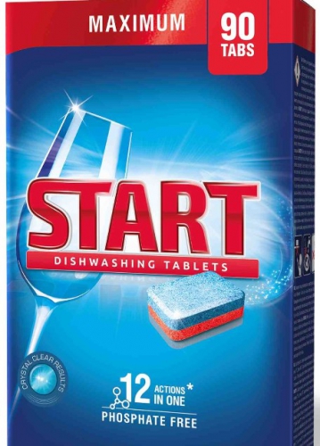 STARTMaximum розроблені спеціально для досягнення максимального ефекту від миття посуду в посудомийній машині. 9 стандартних елементів ми підсилили ще трьома активами. Завдяки їм, таблетка стала більш ефективно видаляти наліт від чаю або кави, а функція ополіскування не дає залишати розводів навіть на прозорому та чистому склі або хромі.