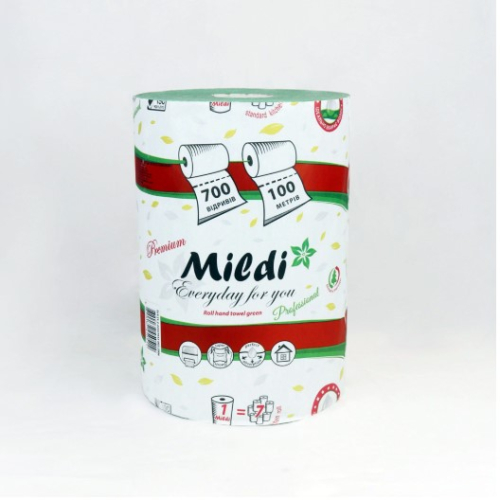 «Mildi Premium» – це міцний та ніжний на дотик одношаровий паперовий рушник з тисненням та перфорацією. Виготовлений із вторинної сировини. Надовго зберігає міцність у вологому стані. Завдяки великому розміру упаковки, ідеально підходить для професійного та домашнього використання. Добре вбирає вологу.
