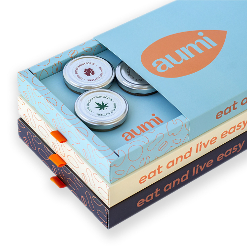 На сайті представлені різні варіанти наборів горіхових паст AUMI по 6 і 4 шт у такій подарунковій коробці. Їх можна знайти в розділі Подарункові набори.