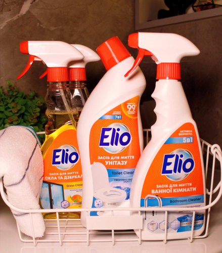 Засіб для миття унітазу TM ELIO очищає унітаз як під обідком, так і нижче за рівень води, видаляє іржу, вапняний наліт, бруд і стійкі плями, забезпечує гігієнічну чистоту, дезінфекцію, свіжість і блиск.