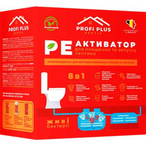 Profi Plus Реактиватор для очищення та запуску септика – це суперконцентрована суміш бактеріальних культур та ензимів для вирішення проблем переповненого та засміченого (заблокованого) септика. (500г)