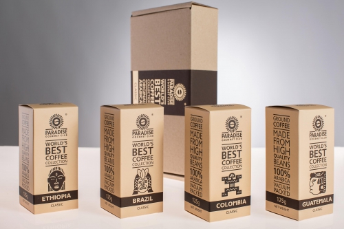 Набор состоит из четырех брикетов. Каждый брикет – это 125-граммовая порция молотого кофе в вакуумном пакетике, упакованная в аккуратную коробочку. В наборе представлены популярные сорта Арабики – Гватемала, Бразилия, Колумбия, Эфиопия.