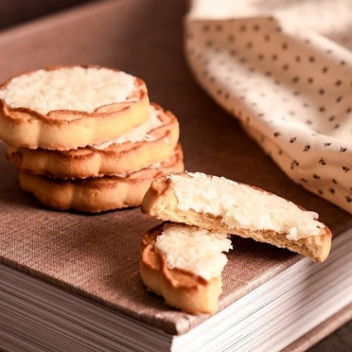 Цукрове печиво оздоблене білою кондитерською масою та посипане кокосовою стружкою.
