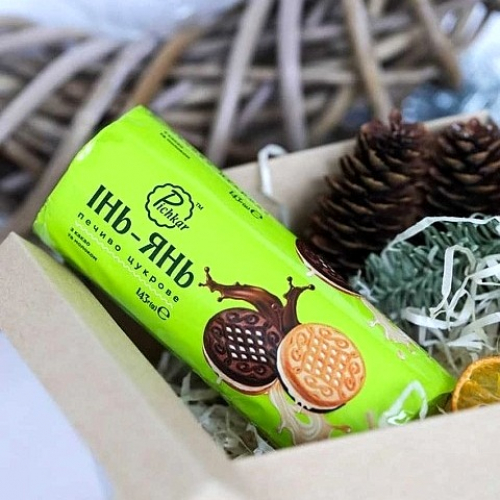 Цукрове печиво-сендвіч, двокольорове (з какао продуктами + з ароматом пряженого молока), перешароване молочною начинкою. Упаковане в індивідуальну упаковку вагою 143 гр.