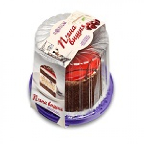 Склад: цукор, спред солодковершковий [суміш молочного жиру та рослинних жирів (олій), в тому числі частково гідрогенізованих], яйця курячі харчові, борошно пшеничне в/с, вишня спиртована 9,2%, сироп вишневий 4,8%, молоко згущене незбиране варене 3%, кондитерська глазур [цукор, жир рослинний (гідрогенізований пальмоядровий стеарин), какао-порошок (14 %), сироватка суха молочна, емульгатор лецитин соєвий, ароматизатори «Шоколад», «Ванілін», сіль кухонна], какао-порошок зі зниженим вмістом жиру, крохмаль картопляний, паста для харчової промисловості [вода, емульгатор (Е 471), вологопоглинаючий агент (Е 1520), емульгатор (Е 475)], кондитерська суміш «Фіорфіоре Леонардо» [модифікований крохмаль Е 1422, стабілізатори (Е 401, Е 450, Е 516), цукор], спирт етиловий, консервант (кислота сорбінова), ароматизатор «Ваніль Карамель», натуральний барвник (Е 120). Містить яйця, глютен, молоко, сою. Може містити незначну кількість горіхів. Обережно! Може містити частинки кісточки вишні.