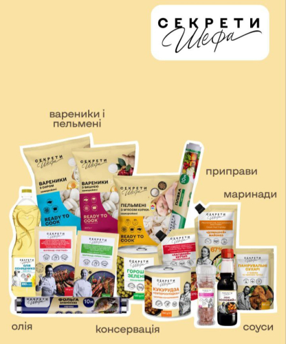 У кожному куточку України, у кожному фірмовому магазині «М’ясомаркет», «Їжа Свіжа» та «Наша Ряба» купуйте великий вибір продуктів та страв «Секрети Шефа».