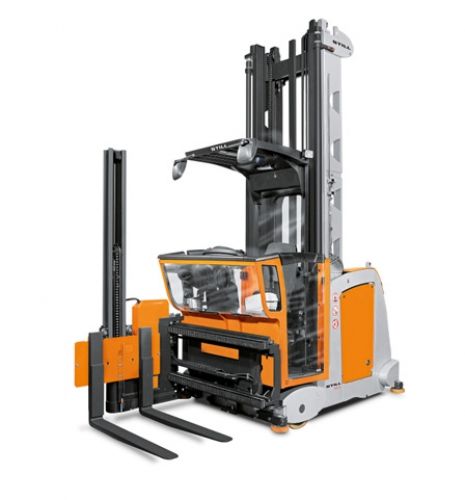 Штабелер данного типа оборудован подъемной кабиной оператора. Это позволяет осуществлять комплектацию и размещение грузов на большой высоте. Максимальный подъем достигает 1285 см. Грузоподъемность данной техники достигает 1500 кг.