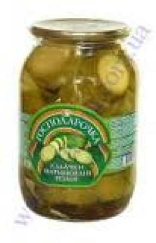 Состав: кабачки, сахар, соль, уксусная кислота, зелень, пряности. Пищевая ценность 100г продукта: углеводов – 5,0 г, витаминов (мг): β-каротин – 1,0; С – 15,0; РР- 0,5; В1 – 0,06.