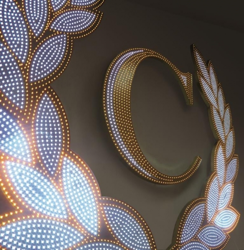 Алюминиевый композитный материал был выбран в основу не случайно, ведь элементам вывески предстояла длительная транспортировка, да и основа должна быть как никогда надежной. Чтобы продемонстрировать клиенту варианты возможных оттенков материала, мы сфотографировали АКП в совмещении – это были медный цвет, зеркальное золото, матовое золото, браш… Чтобы не смазывать эффект динамического свечения - выбор пал на матовое золото. Для создания аккуратного и ровного канта по периметру символов был установлен профиль-трим 50 мм золотистого цвета. Лицевая часть символов выполнялась из двух цветов алюминиевого композита белого и золотистого цвета. В золотистых символах были вставки аккуратно выфрезерованных белых деталей. Поскольку для подсветки были выбраны точечные диоды, то в лицевой поверхности было необходимо отфрезеровать под них круглые отверстия. А отверстий оказалось не много, не мало, а 19480 штук. Это несколько дней работы фрезера.
