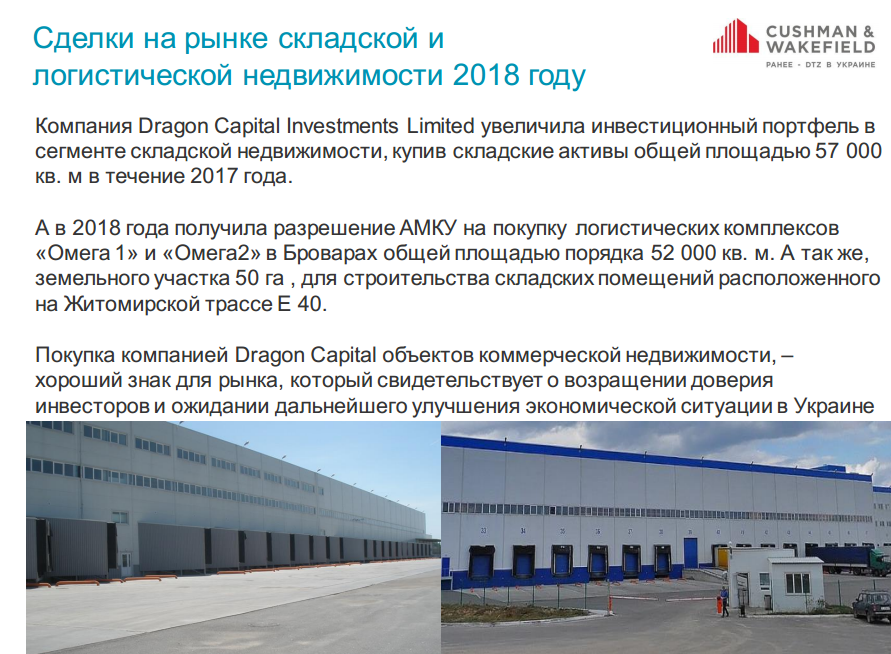 Нельзя обойти вниманием активизацию инвесторов на рынке. Компания Dragon Capital Investments Limited увеличила инвестиционный портфель в сегменте складской недвижимости, купив складские активы общей площадью 57 000 кв. м в течение 2017 года. И в этом году она получила разрешение АМКУ на покупку двух складских комплексов Омега – 1 и Омега – 2. Также на днях АМКУ подтвердила разрешение на покупку участка размером 50 гектаров, расположенного на Житомирской трассе. Покупка таким крупным инвестором коммерческой недвижимости в Украине — это хороший признак и говорит о дальнейшем доверии к рынку и об ожидании улучшения экономической ситуации в Украине.