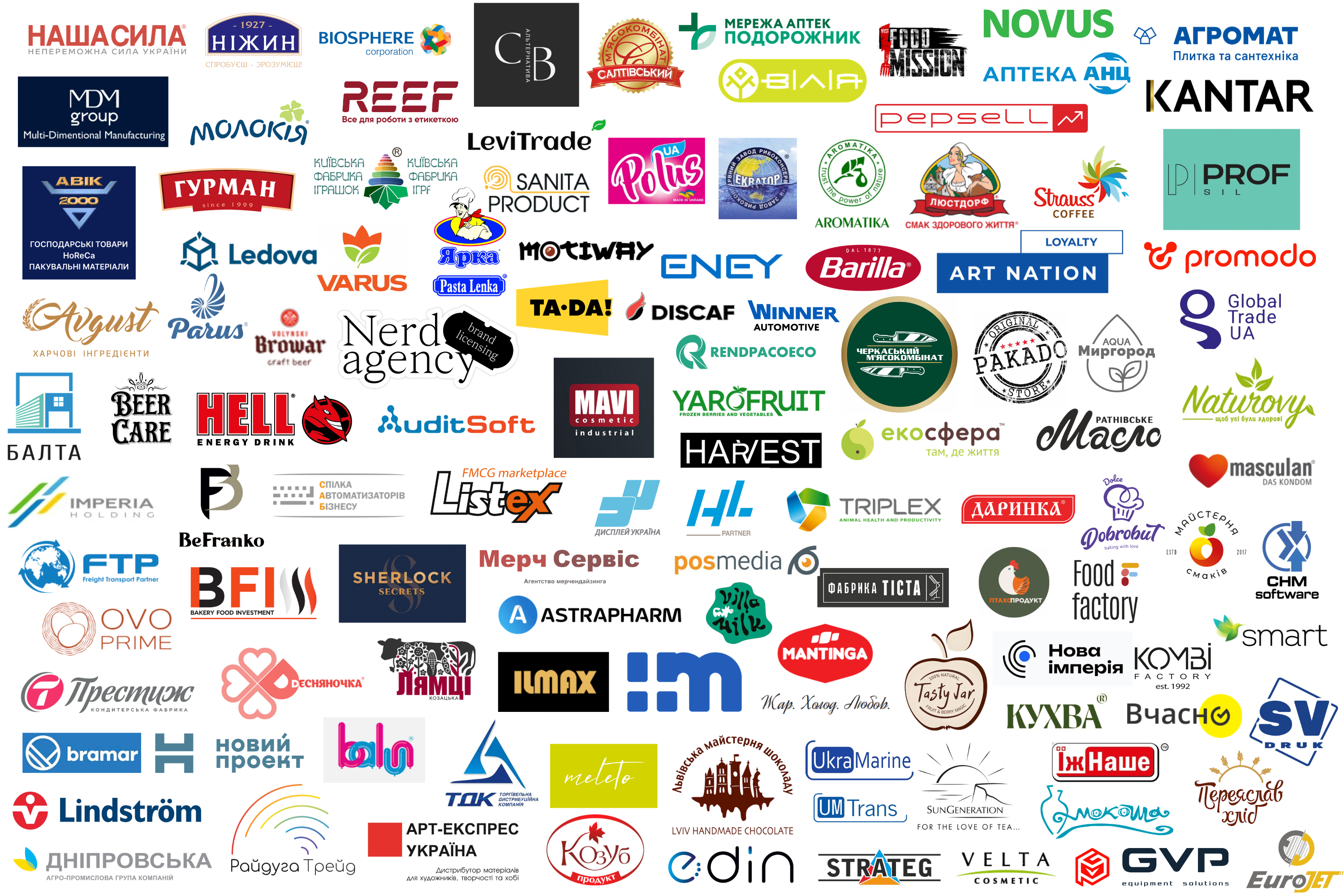 Роздрібні мережі України (топ-50): "Метро Кеш енд Кері Україна", VARUS, "Таврія-В", "Велика Кишеня", "Фоззі Груп", Novus, "Наш край", "Укр-Трейд" , "АТБ-Маркет", "ВОГ Рітейл", "Львівхолод", "Еко-маркет", "Вересень Плюс", "КЛО", "Фора", "Економ Плюс", "Чудо Маркет", UPG, "Епіцентр К", "Пчілка маркет", мережа "Тайстра", мережа "Сім-23", "Бадьорий", "Аврора Мультимаркет", "Восторг", "Аргон (Грош)", "БРСМ-Нафта", "ПАНІ", Мережа гіпермаркетів "ЗаТак", Bulka маркет та ін.