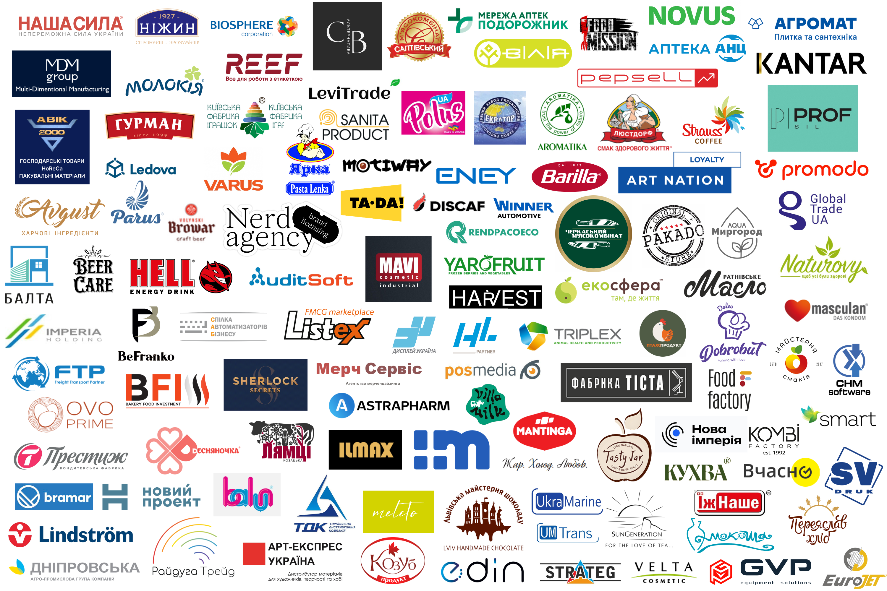 Роздрібні мережі України (топ-50): "Метро Кеш енд Кері Україна", VARUS, "Таврія-В", "Велика Кишеня", "Фоззі Груп", Novus, "Наш край", "Укр-Трейд" , "АТБ-Маркет", "ВОГ Рітейл", "Львівхолод", "Еко-маркет", "Вересень Плюс", "КЛО", "Фора", "Економ Плюс", "Чудо Маркет", UPG, "Епіцентр К", "Пчілка маркет", мережа "Тайстра", мережа "Сім-23", "Бадьорий", "Аврора Мультимаркет", "Восторг", "Аргон (Грош)", "БРСМ-Нафта", "ПАНІ", Мережа гіпермаркетів "ЗаТак", Bulka маркет та ін.