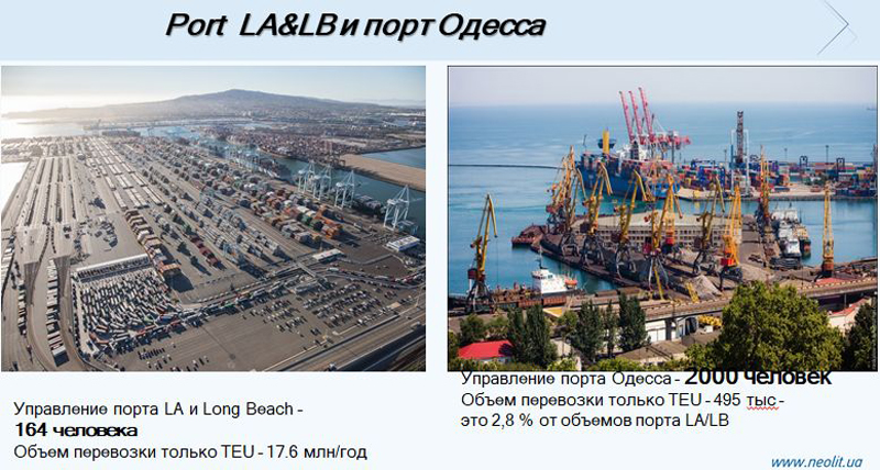 Управление в порту Одесса (два портоуправления) – 2 тысячи человек. Объем перевозки только TEU – 495 тыс. – 2,8 % от объемов порта LA/LB.