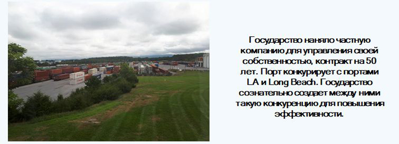 Еще один пример участия государства в США в создании эффективных логистических процессов - Сухой порт Вирджинии (Virginia Inland Port). Это государственный порт, который конкурирует также с государственными портами Лос-Анджелеса и Порт Лонг Бич. Несмотря на то, что он принадлежит государству, это самое государство приняло решение отдать его в частные руки, как минимум на 50 лет – с тем, чтобы создать искусственную конкуренцию для своей же собственности. По замыслу чиновников, теперь все три порта будут конкурировать между собой за грузопоток, что послужит драйвером развития для всей отрасли.