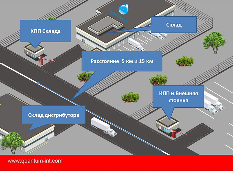 Как все это работает? Объекты: Склад, КПП Склада, КПП Внешней стоянки и Склад дистрибутора. После прибытия транспортного средства на внешнюю парковку, происходит идентификация, данные о том, какой автомобиль прибудет, поступают в Qguar YMS из внешней ERP системы клиента. То есть, система предварительно уведомляется, что автомобиль прибудет в определенное время. Происходит идентификация транспортного средства, водителя, и проверка соответствия этих данных с занесением в систему. Происходит активация листа визита, его распечатка, и постановка на внешнюю парковку.