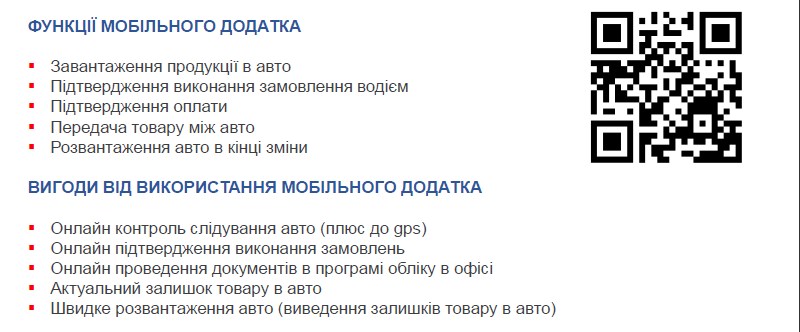 Який результат дали ці дії? Фізично кожен водій отримав мобільний телефон з завантаженим у нього додатком, який показує конкретну точку наступної доставки. Коли водій приїздить на місце, то одразу бачить: яку кількість товару необхідно віддати, скільки цей товар коштує, та які документи взяти. Після здійснення доставки в додатку треба натиснути кнопку, яка підтверджує закриття замовлення. Щойно водій закриває замовлення, інформація про це надходить в центральний офіс.