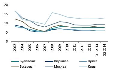 Ставки доходности наиболее качественных объектов офисной недвижимости в Киеве и других столицах Центральной и Восточной Европы (%)