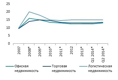 В период с июня 2013 года до апреля 2014 года компания DTZ не фиксировала изменений ставок доходности, но, учитывая снижение арендных ставок, стоимость объектов коммерческой недвижимости была подвержена снижению. В течение второго квартала 2014 года ставки доходности на офисные и торговые объекты наивысшего качества выросли на 0,5%, а ставки доходности на складские объекты оставалась стабильными. Однако ввиду отсутствия сделок на открытом рынке, данный анализ базируется на оценках потенциальных инвесторов, заинтересованных в приобретении ряда активов.
