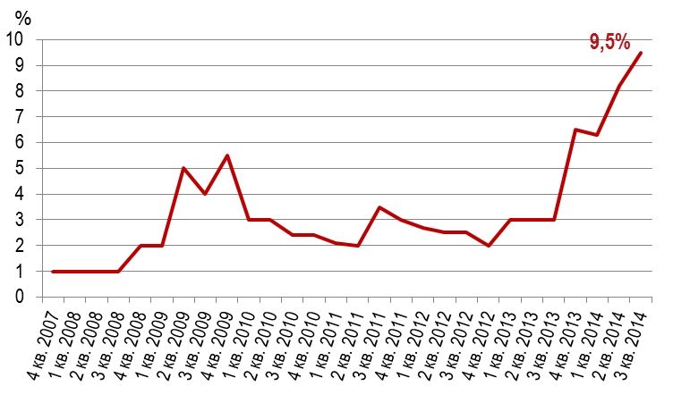 По подсчетам компании JLL, доля свободных помещений на рынке качественных торговых центров Киева по итогам ІІІ-го кв. 2014 года увеличилась к прошлому кварталу на 1,3 п.п. – до 9,5%. Данный показатель является самым высоким за всю историю рынка торговой недвижимости столицы Украины. Для сравнения, в 2009 году в торговых центрах было вакантно около 5% помещений.