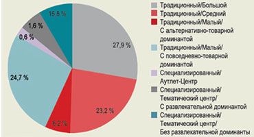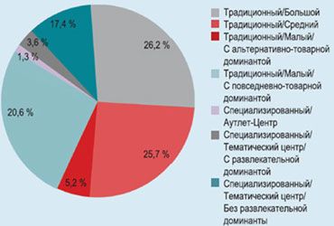 традиционные: очень большой (GLA − 80 000 кв.м и более), большой (40 000 – 79 999 кв.м), средний (20 000 – 39 999 кв.м), малый с альтернативно-товарной доминантой и малый с повседневно-товарной доминантой (5000 – 19 999 кв.м).