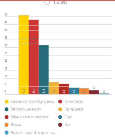 В исследовании отмечается, что в первом квартале 2015 года по сравнению с аналогичным периодом 2014-го доля покупок в супермаркетах увеличилась на 1,1%, доля покупок продуктов питания на рынках снизилась на 4,5%, и в гастрономах/универсамах доля покупок снизилась на 4,2%. Доля покупок онлайн увеличилась за год лишь на 0,1%.