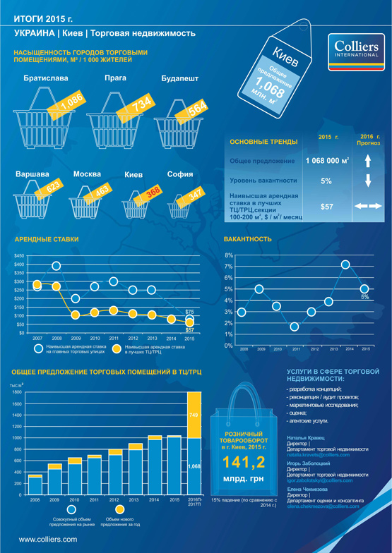 К концу 2015 года общее предложение качественных торговых помещений в Киеве составило порядка 1,068 млн. м². Киев, наряду Софией, характеризуется одним из самых низких показателей насыщенности качественными торговыми площадями среди городов Восточной Европы - 368 м2 на 1 000 человек. Для сравнения в Варшаве – 623 м² на 1 000 жителей, в Праге – 734 м²).