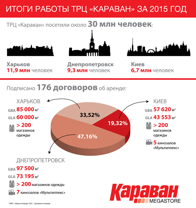 Результат не заставил себя ждать: за 12 месяцев прошлого года три ТРЦ «Караван» (Киев, Харьков, Днепропетровск) посетили около 30 млн человек, а также было подписано 176 договора об аренде.