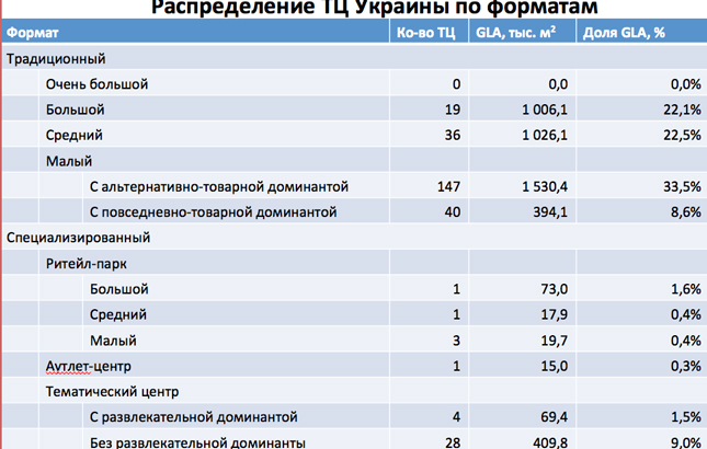 Таким образом, в Украине насчитали 19 больших, 36 средних и 187 малых традиционных ТЦ, а также 28 специализированных ТЦ.
