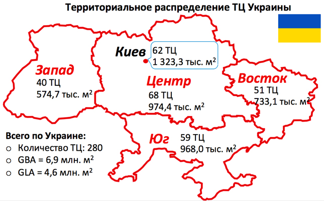 В результате исследования, проведенного по всем торговым центрам Украины, эксперты установили, что в Украине на данный момент насчитывается 280 ТЦ. Их GBA составила 6,9 млн кв. м, GLA – 4,6 млн. кв. м. Наиболее насыщенными торговыми центрами регионами оказались центр страны и Киев, меньше всего ТЦ исследователи насчитали на западе Украины.