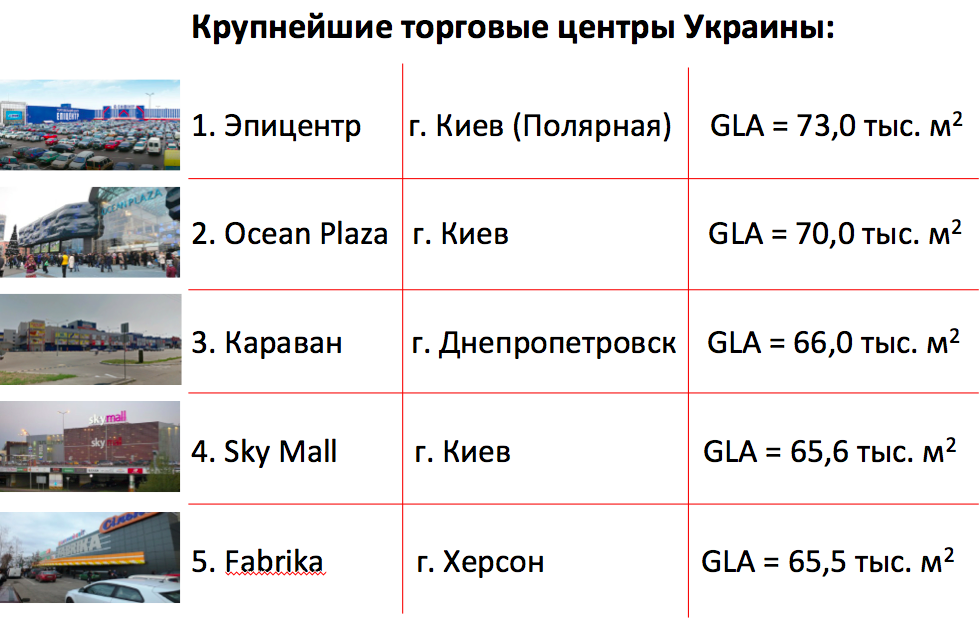 Крупнейшим ТЦ Украины стал «Эпицентр», расположившийся в Киеве на ул. Полярной. Как объяснил руководитель ICSC Ukraine Research Group Дмитрий Топольсков, изначально этот объект не подпадал под критерии классификатора, но после того, как в нем появились супермаркет «Сильпо» и магазин «Золотой век», его стали считать специализированным торговым центром. «Поэтому мы внесли этот комплекс в нашу классификацию», – отметил эксперт.